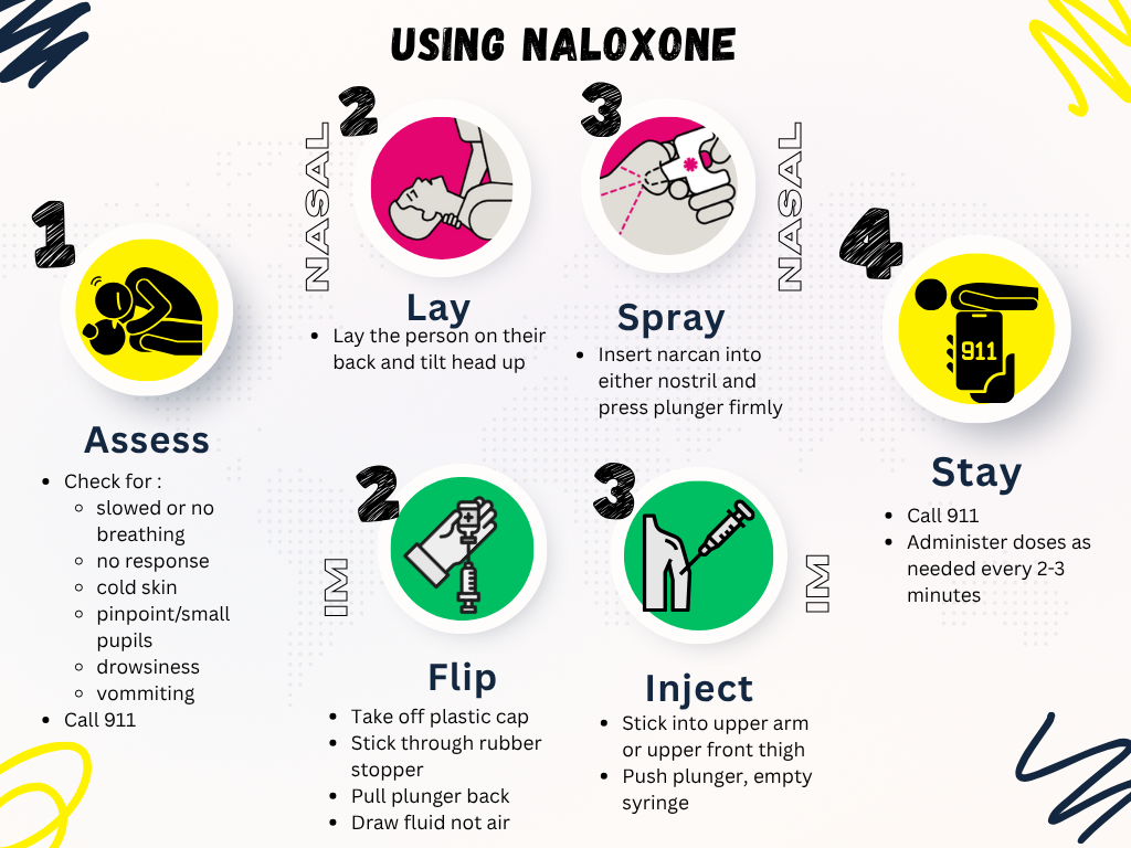 ButtonNaloxone should be used when an individual shows signs or is suspected of an overdose. It comes in two forms, nasal and Intramuscular. Use a form that available.